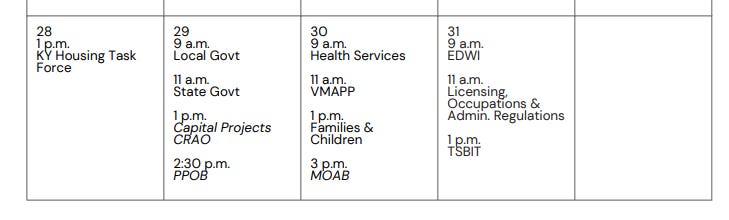 Lawmakers have a full week in Frankfort the last week of July, with task force and interim committee meetings scheduled Monday through Thursday.